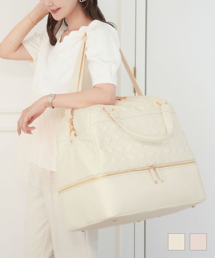 モデルの中田絵里奈さんがプロデュースする大人ガーリーなブランド「le reve vaniller」。ハート柄キルティングのボストンバッグはまさに気分の上がるトラベルバッグですよね。デザインだけでなく、収納性も高いのがポイント。シューズ収納ができるファスナーポケットが付いており、お洋服に合わせてシューズを変えたい方、またお子さんの靴を複数持っていきたい方にもぴったりです。機内持ち込み可能なサイズになっています。