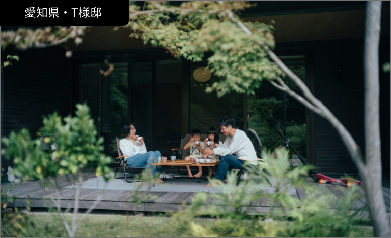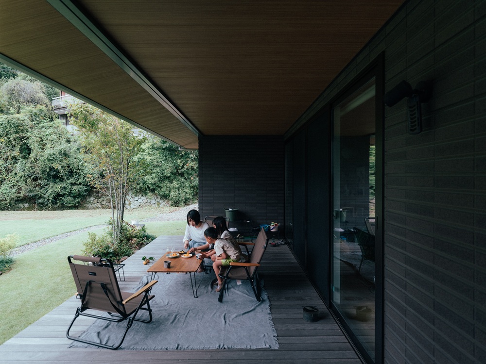 ウッドデッキは深い軒が日差しを和らげ、外にいながら快適に過ごすことができます。