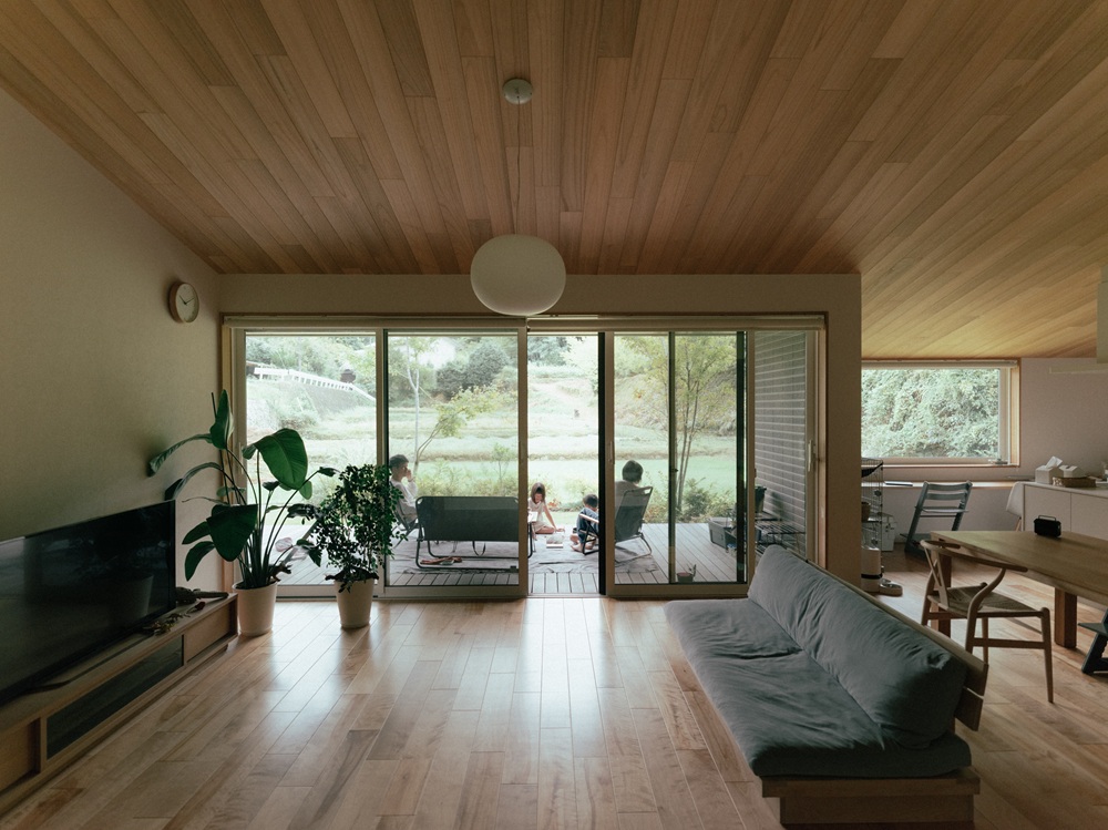子どもが生まれて手狭になっていた1DKのアパート。「休日に出かけなくていい、居心地の良い家を」という思いから、豊かな自然と調和する小屋吹き抜けの平屋を建てました。